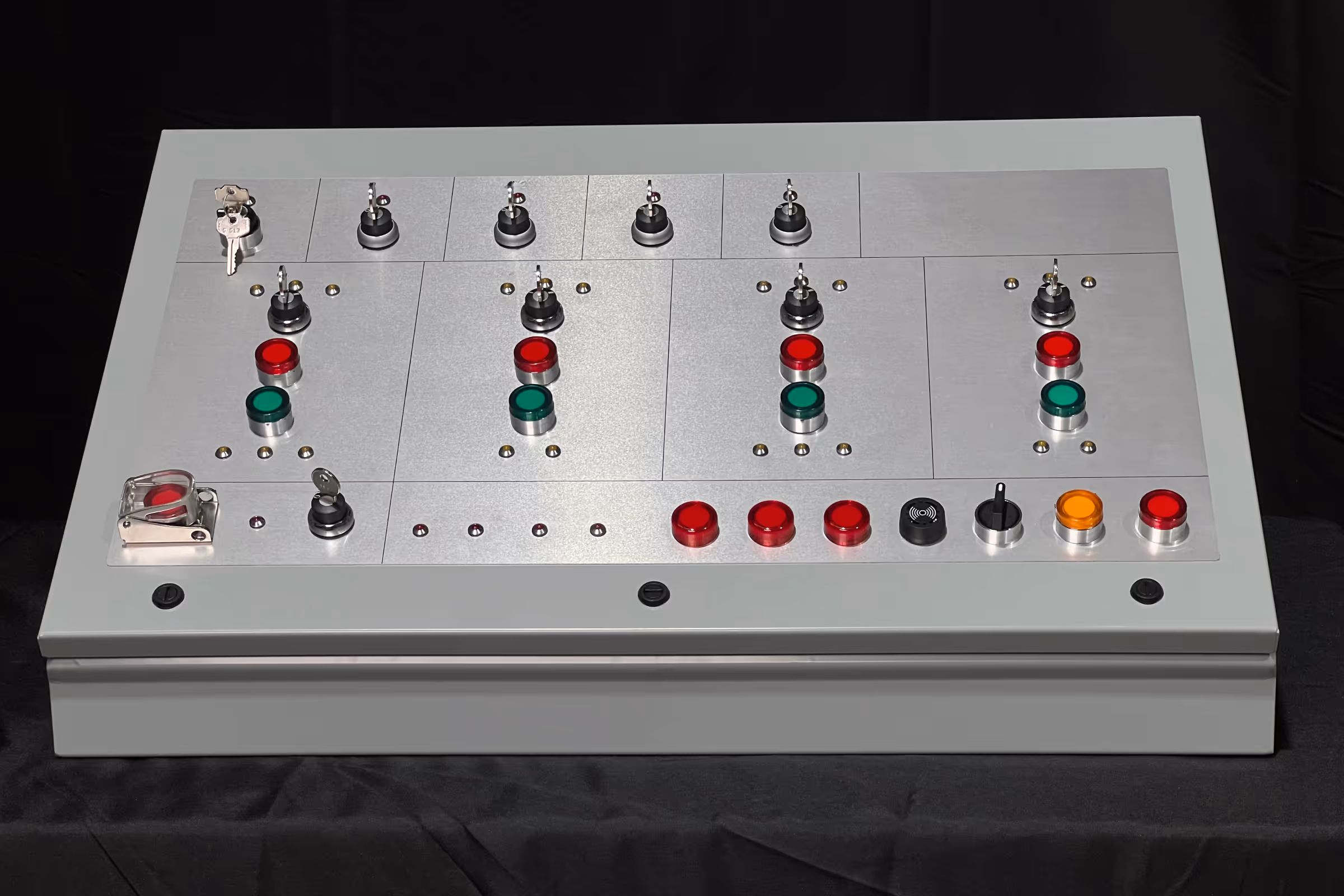 This custom control console serves as the essential manual interface for a large-scale industrial automated process. While the facility's system is designed for full automation, this panel provides operators with the critical ability to take direct, hands-on control when needed.